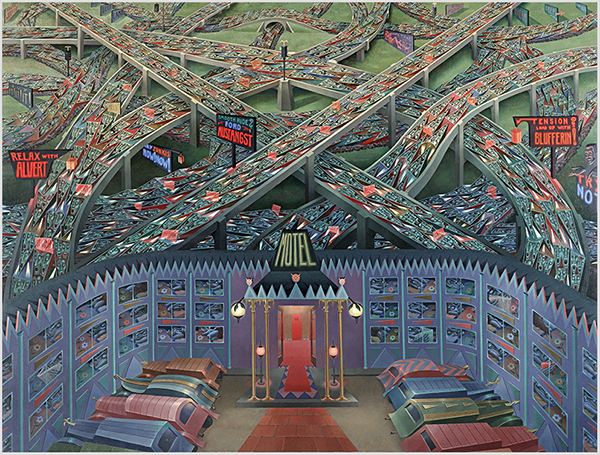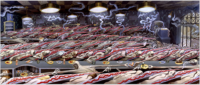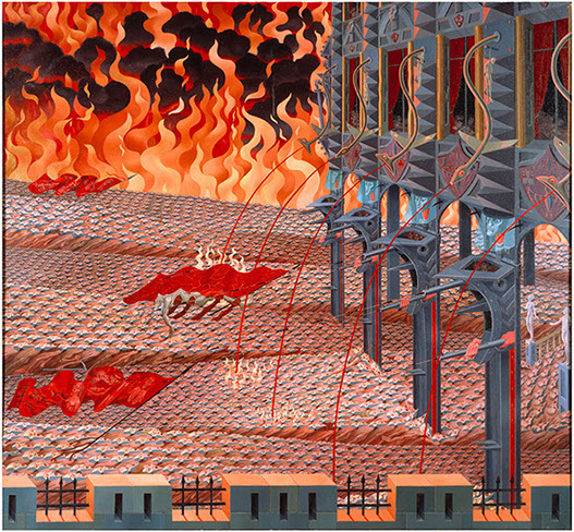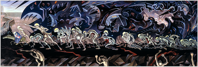 Air Raid - 1977, 100 by 64 inches (reworked from a 1958 canvas)